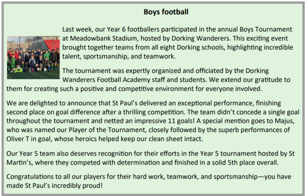 Year 5 had a fantastic football tournament hosted by St Martin's School. They played incredibly well, showing respect and sportsmanship. After a full afternoon of football, our Year 5 team came 4th. Well done St Paul's