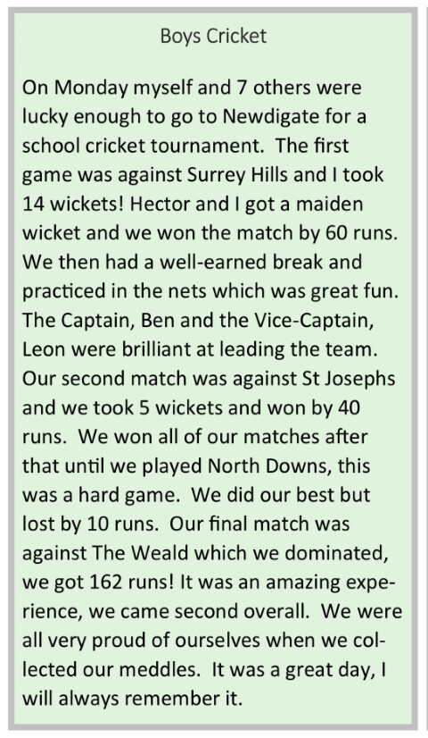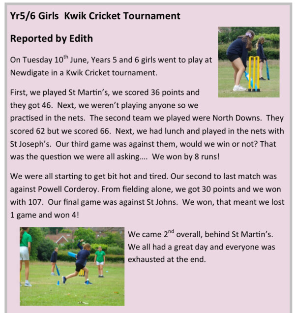 A few weeks ago, year 6 went to Powell Corderoy to compete in a rounders tournament against local schools. Our first game was against North Downs, where we sadly lost only by half a rounder. After a couple of games we were sweating as it was sooo hot. Our best game was against the Weald, we beat them by 6 rounders! Finally, it came to the end when we won 5 games and lost 1. Sadly Powell had also won 5 games and lost one which was against us. The head of the tournament said 2nd and 1st had to come down to rounders as we had the same amount of wins. The difference was only 1 and a half rounders. My heart was pounding like a drum when we heard that Powell had come 2nd meaning we came 1st!! We went crazy and lifted the well earned silverware like we won the world cup. If Miss George wasn’t there, we would’ve never been able to compete in the tournament. Thank you Miss George for everything you do, you are the best sports coach ever.